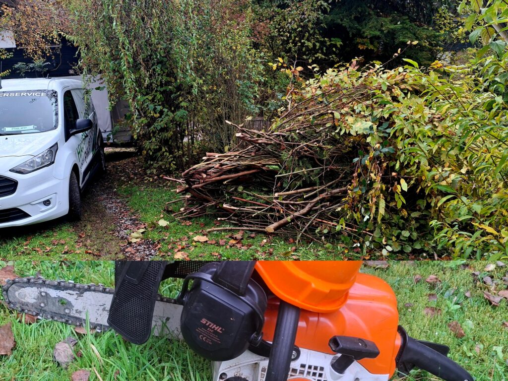 Saisonaler Rückschnitt und fachgerechte Entsorgung des Schnittguts.